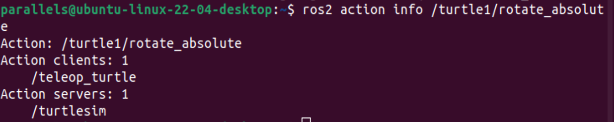 the /turtle1/rotate_absolute action for /turtlesimis under Action Servers. This means /turtlesim responds to and provides feedback for the /turtle1/rotate_absolute action.